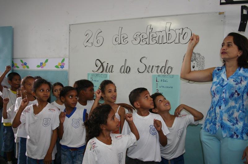 Durante todo o dia de ontem, 26, as escolas municipais de Ensino Fundamental Oscar Nascimento e Presidente Vargas celebraram juntas o Dia do Surdo. A comemoração, que ocorreu também em várias escolas da rede municipal, reuniu dezenas de alunos na Oscar Nascimento, situada no bairro Santo Antônio, pois é uma das unidades da rede que trabalha diretamente com crianças portadoras de deficiência auditiva, tendo, inclusive, o coral Mãos Falantes, compostos por crianças com e sem problemas de surdez. O objetivo principal da comemoração foi aproximar ainda mais as crianças com este tipo de deficiência das que não possuem, para que desta interação resulte um eficaz desenvolvimento educacional e processo de inclusão social dos surdos. A Linguagem Brasileira de Sinais faz parte do cotidiano de professores e alunos da escola Oscar Nascimento, que atende 16 alunos da região e outras seis crianças de outras instituições, todas com problemas de surdez. A unidade de ensino possui três professores especialmente capacitados para realizar o processo de inclusão. Também possui sala completamente adaptada para este tipo de atividade. Durante a comemoração, os alunos da 1ª série apresentaram um número musical e uma historinha infantil para os colegas da escola. Para que todos pudessem entender o que estava sendo transmitido, a garotada se encarregou de interpretar para ou ouvintes e não ouvintes tudo o que estava acontecendo. Sempre trabalhei com crianças especiais, mas quando cheguei aqui tudo foi diferente, pois aprendi a linguagem dos surdos, o que facilitou ainda mais meu relacionamento com as crianças. Além disso, a escola realiza aulas de coral para fazer, e está fazendo, com que os estudantes aprenderem com mais animação. Também convidamos os pais para aprenderem a Libras, disse a coordenadora geral da EMEF. Oscar Nascimento, Denise Carvalho.