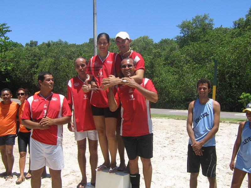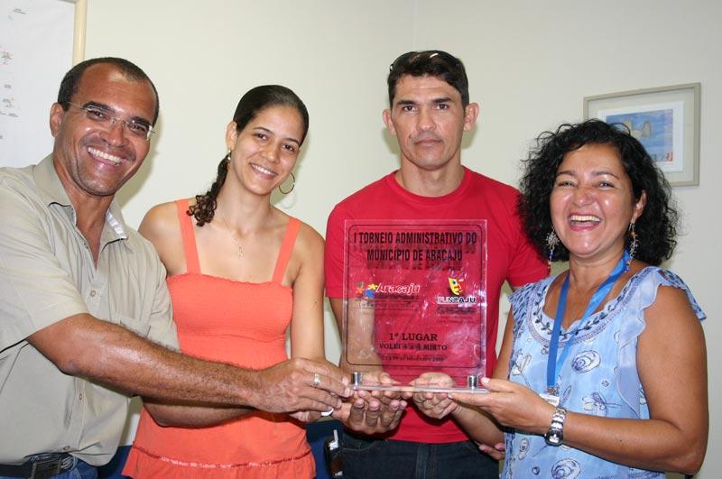 A Secretaria Municipal da Educação foi a campeã da modalidade vôlei 4x4 misto no I Torneio Administrativo do Município de Aracaju, que aconteceu no último final de semana nas quadras da Praia 13 de julho. A equipe foi composta por João Júnior (DRH), Rosângela Morais (Defin), Gladston Menezes (Núcleo de Tecnologia Educacional), Ruthenilson Macedo (Defin) e Carlos Gomes (Ditran). A competição, que foi organizada pela Fundação Municipal de Cultura, Turismo e Esportes (Funcaju), foi dividida nas modalidades de vôlei e futsal masculino e feminino, e contou com a participação de 300 atletas de 13 secretarias. A equipe da Semed disputou seis partidas e foi vencedora em todas elas, não perdendo nenhum tempo. A experiência foi muito boa. Seria ideal que fossem criados mais eventos desse tipo para estimular os funcionários. Espero que na próxima edição sejam incluídas outras modalidades, afirmou João Júnior. De acordo com a secretária municipal da Educação, professora Tereza Cristina Cerqueira da Graça, que fez a entrega simbólica do troféu à equipe vencedora, atividades desse tipo são importantes por agregar o servidor, desenvolver o espírito esportivo e a saúde, além de tornar possível um envolvimento entre as secretarias. Estou muito feliz com minha equipe e esperançosa de que no próximo evento como este, a de futebol também vai ganhar, brincou a secretária. O segundo lugar do vôlei 4x4 misto ficou com a Secretaria Municipal de Serviços Urbanos(Emsurb) e o terceiro com a Marca Tigre- Funcaju.