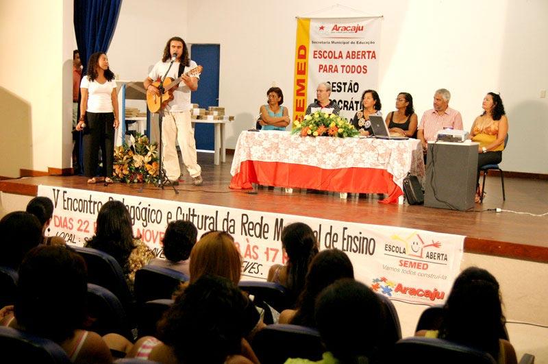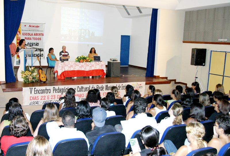 A Secretaria Municipal de Educação (Semed) realiza, hoje e amanhã, o V Encontro Pedagógico e Cultural da Rede Municipal de Ensino. O evento acontece no Espaço Cultural Sest/Senat, das 8 às 17 horas, situado na avenida Tancredo Neves, com a participação de 24 escolas da rede municipal de ensino, contando ainda com a presença de técnicos da Semed. Durante a manhã de hoje aconteceu a abertura oficial do evento, contando com a apresentação artístico-cultural com a poesia de Diomedes Santos Silva, musicada por Beto e Anabel. Em seguida foi realizado o lançamento dos ´Anais do IV Encontro Pedagógico´, resumo de todos os assuntos discutidos no IV encontro, que aconteceu em 2004. Dando seqüência às atividades, o palestrante convidado Hamilton Wernck realizou uma conferência com o tema ´Abordagem interdisciplinar na educação: desafios à formação do novo homem requerido pela sociedade contemporânea´, promovendo um debate após o encerramento de sua palestra, onde os professores puderam discutir sobre o assunto abordado. De acordo com a secretária de Educação, Tereza Cristina, o evento tem como ponto fundamental a socialização entre professores. Através desse intercâmbio os professores divulgam seus trabalhos e compartilham experiências, explica a secretária. Ela ressalta ainda que os professores precisam estar atentos às perspectivas de educação para que o nível educacional possa ser ainda melhor. Para a professora Rosângela Oliveira, esse é um dos eventos mais importantes na área educacional em Aracaju. Aqui temos a oportunidade de trocar experiências e ter nosso trabalho reconhecido, o que é muito gratificante e nos incentiva a realizar trabalhos ainda mais qualitativos, comenta. Na área externa do Espaço Cultural foram montados diversos stands com os trabalhos desenvolvidos nas escolas, tendo a participação de centros sociais que são parceiros da Prefeitura de Aracaju, além da participação o Centro de Apoio Pedagógico ao Portador de Deficiência Visual (CAP), único no Estado a atender toda demanda de deficientes visuais. Participaram da mesa de apresentação o secretário de governo, Sílvio Santos, a diretora-presidente da Aracaju Previdência, Rosângela Santana, além da diretora de ensino da Semed, Rosângela Cruz. Programação para tarde de hoje 14 h Apresentação cultural: Grupo de Dança da EMEF Maria Thétis Nunes 14h30 Apresentação de projetos a) Projeto Cidadania nos Trilhos Escola Manoel Bonfim b) Aracaju em seus 150 anos Memórias de Aracaju EMEF. Tancredo Neves / Projeto Aracaju, 150 anos de História - EMEF Gal. Freitas Brandão c) Projetos da Semed - Escola Lugar de Vida: educação Chico Mendes - Laborart - O uso do piercing e tatuagem com responsabilidade d) Projetos em Parceria - Projeto Petrobras - Mini - Hand - EMEF Oviêdo Teixeira