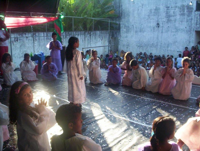 A inauguração do projeto ´Natal legal´ envolveu cerca de 500 participantes, que celebraram juntos o período natalino. O evento foi realizado pela Escola Municipal de Ensino Fundamental Anísio Teixeira, situada no Bairro Atalaia, com o apoio da Secretaria Municipal da Educação (Semed), da loja do grupo G.Barbosa instalada na Atalaia, do Sindipema e da comunidade escolar. O projeto, que agrega sete temas e todos ligados a sentimentos e valores humanos como amizades, respeito e perdão, tem como principal objetivo transmitir alegria, solidariedade e paz nas comemorações deste final de ano. Aproximadamente 150 alunos coreografaram peças musicais, todas pautadas nos temas propostos pelo ´Natal Legal´. A música ´Sal da terra´ retratou a solidariedade; a ´Pai nosso´ transmitiu amor e amizade e ´Mantra´ resgatou o espírito de Natal, explicou a coordenadora geral da EMEF Anísio Teixeira, Josenaide Magalhães da Silva Araújo. Ela destacou a importância da colaboração de algumas parcerias, como por exemplo, a do G.Barbosa através do Projeto Loja & Comunidade, que doou os brindes para a festa, e da Semed, que forneceu a montagem de palco, iluminação e cadeiras. A coordenadora disse ainda que para abrilhantar o evento, o vendedor de picolé que sempre fica próximo à unidade escolar se vestiu de Papai Noel e com um sino, entrou pela escola chamando a atenção das pessoas, algo que para a maioria foi inusitado, uma vez que a cada ano a figura do ´bom velhinho´ é menos utilizada. Os alunos adoraram e os adultos ficaram surpresos, além de emocionados, revelou a professora, que ressaltou a importância de valorizar as tradições e culturas dos povos. Para finalizar a confraternização, os estudantes do projeto ´Dó-ré-mi´ se apresentaram, mostrando a toda comunidade o que aprenderam nas oficinas de percussão, teclado, violino, flauta doce, dança e violão. Todos preparam um repertório especial, composto por temas natalinos. Posso dizer que o primeiro ano do projeto foi um sucesso e que em 2007 será ainda melhor, concluiu Josenaide Magalhães.