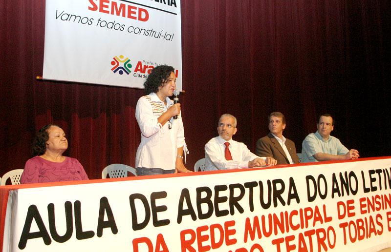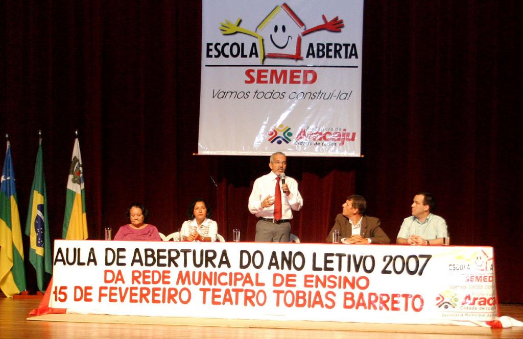 No início da manhã de hoje, quinta-feira, o prefeito de Aracaju, Edvaldo Nogueira, participou da aula inaugural da rede municipal de ensino promovida pela Secretaria Municipal de Educação (Semad). Edvaldo deu as boas-vindas a todos os professores, diretores, coordenadores e técnicos do município presentes no Teatro Tobias Barreto, onde aconteceu o evento. E afirmou que a qualidade no ensino municipal será sua principal meta de trabalho nos próximos anos de Governo. O prefeito falou sobre a importância da educação básica e fundamental na vida das crianças e dos adolescentes para construção da vida adulta e profissional. Estou muito feliz e orgulhoso de poder estar aqui hoje. No atual cenário globalizado em que vivemos, pais e mães saem para o mercado de trabalho e muitas vezes é do professor que as crianças e jovens vão receber sua quase total educação, comenta Edvaldo, acrescentando que a escola tem um papel fundamental no crescimento individual de cada ser humano. A tarefa do professor é extraordinária, incomparável e insubstituível a qualquer tecnologia. Se não fosse a educação pública eu não teria chegado a onde cheguei. E é por isso que eu quero começar a tratar ainda mais desse assunto, porque eu quero me preocupar com o menino que está saindo da escola, fala o prefeito. Hoje os jovens estão se formando com menos qualidade e é por isso que começo hoje aqui uma cruzada com os alunos da rede pública municipal de ensino e vou convocar toda a sociedade para se engajar comigo nessa luta, declarou Edvaldo Nogueira. Nogueira fez um apelo aos professores, solicitando ainda mais dedicação e paciência para com os alunos e agradeceu pelo trabalho desenvolvido pela classe. Realmente o salário do professor ainda não é o que deveria ser, mas já melhorou muito. Os professores da rede estadual ganham muito menos e a Prefeitura de Aracaju repassa 25% da arrecadação para a Secretaria, ressalta. Nós já avançamos muito, contudo ainda falta qualidade no ensino. As crianças não podem mais sair das escolas sem saber ler e escrever, e a nossa administração vai trabalhar para ver os resultados, adianta o prefeito. O prefeito encerrou seu discurso recitando o poema ´O livro e a América´, de Castro Alves, que fala da importância do livro na vida de cada indivíduo. Edvaldo ainda afirmou que confia muito na capacidade de luta, no compromisso e na consciência que os professores e professoras do município têm com os alunos de Aracaju. A programação prosseguiu com a palestra´Os desafios da Educação no século XXI´, ministrada pelo professor doutor João Francisco Lopes de Lima, da Universidade Cândido Mendes do Rio de Janeiro. Estiveram presentes no evento a secretária municipal de Educação, Tereza Cristina; o presidente da Fundat, Carlos Magno; o secretário de Finanças, Jeferson Passos; o secretário Chefe Gabinete, Bosco Rolemberg, e o diretor interino da Guarda Municipal, Ivanildo Santana. Veja mais... Professor pela Universidade Cândido Mendes faz palestra em aula inaugural da rede municipal