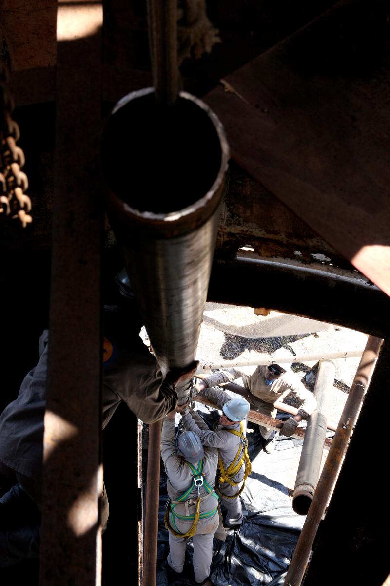 Para que o ritmo acelerado não seja interrompido, no local foi montada uma fábrica para recuperar e fabricar peças. Atualmente 14 homens trabalham na primeira etapa dos serviços. Depois, outras pessoas farão a restauração na parte mais detalhada.