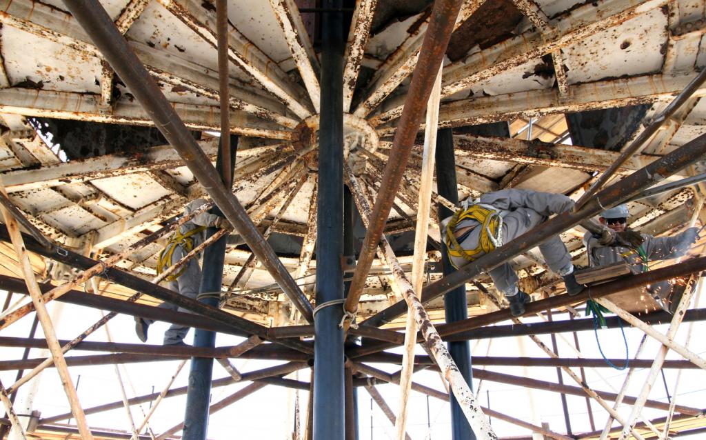 Em seguida, será feita a substituição de paredes danificadas, portas de correr em aço, portas de madeira, janelas, aduelas, molduras e vidros de janelas, porta de visita e ventilação, escadarias, base da lanterna, completando com o reforço da estrutura dos forros e das bases de concreto dos pilares. Neste processo, todas as soldas obedecerão as especificações ´Welding Building Construction´ - AWS A 5.1, da American Welding Society, com emprego de eletrodos E 7018 e 7013, os mais indicados para a união de superfícies de aço que apresentam até 20% de desgaste.