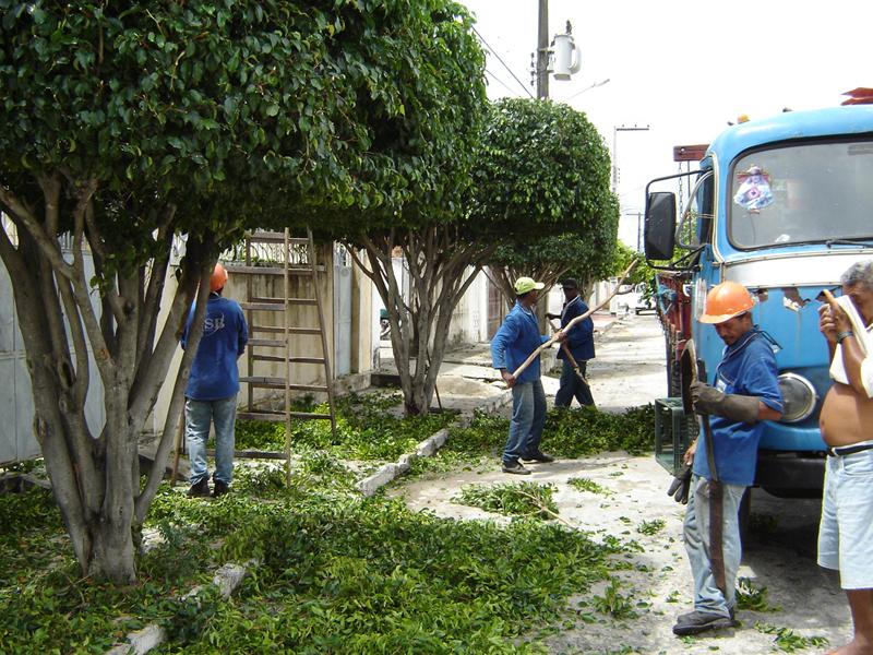 Três equipes da Gerência de Áreas Verdes da Empresa Municipal de Serviços Urbanos (Emsurb) estão executando serviço de podação em regime de mutirão no conjunto Augusto Franco. A ação está sendo feita em todas as árvores das ruas do conjunto, assim como as árvores às margens dos canais. De acordo com o gerente de Áreas Verdes, Francisco Ney Maia, todas as etapas do conjunto Augusto Franco estão passando por esse mutirão, pois diversas árvores já estavam prestes a atrapalhar a sinalização de trânsito. A podação está sendo executada no intervalo de tempo certo. Se demorasse mais um pouco os galhos iriam atrapalhar a visibilidade dos motoristas e pedestres para as sinalizações de trânsito, relata. As árvores que estão às margens dos canais das quatro etapas do conjunto também estão sendo podadas. Segundo o coordenador de Áreas Verdes da Emsurb, Valtênio Rodrigues, as podações das árvores dos canais são de grande importância para a limpeza e o escoamento da água que corre no canal. A podação das árvores é importante para evitar o transbordamento das águas nos períodos de chuva, pois as folhas que caem no canal podem obstruir o fluxo de água, causando alagamento, explica.