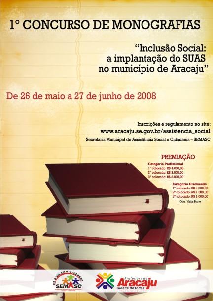 A Prefeitura Municipal de Aracaju (PMA) abriu inscrições para o I Concurso de Monografias da Assistência Social, cujo tema é 'Inclusão Social - A Implantação do SUAS no município de Aracaju'. Os interessados devem fazer a inscrição pela internet até o próximo dia 27 de junho. O Concurso será dividido nas categorias Profissional e Graduando, envolvendo formados e estudantes de qualquer curso de nível superior. Ao total serão entregues mais de R$ 13 mil em prêmios.