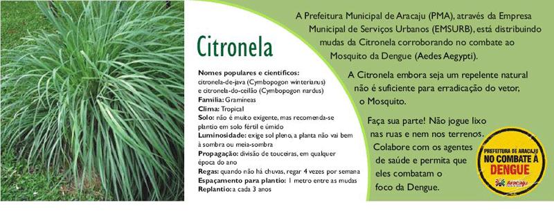 A Prefeitura Municipal de Aracaju, por meio da Empresa Municipal de Serviços Urbanos (Emsurb), continua entregando à população mudas de citronela, planta considerada repelente natural contra mosquitos e pernilongos. A distribuição, que teve início na última segunda-feira, terá continuidade na zona sul, oeste e norte da cidade.
