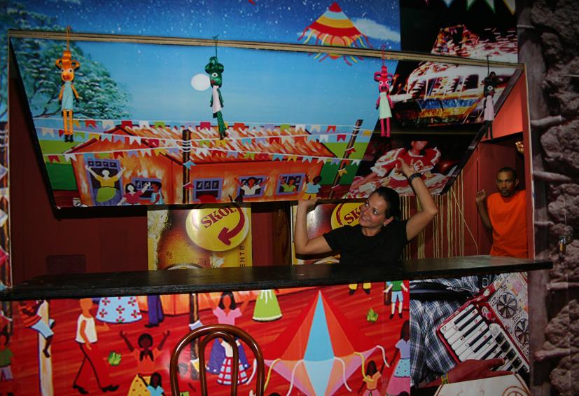 O Bar Teimonde já recepciona seus clientes de forma junina. Uma grande boneca dá as boas vindas e a placa com o nome do bar foi customizada com tecido de chita, assim como as 80 mesas do local. Leonor Luna, a decoradora e esposa do proprietário do bar, Lealdo Feitosa, não esqueceu nem da entrada dos banheiros. "Ela pensa em tudo e nada escapa ao seu olhar", conta ele.