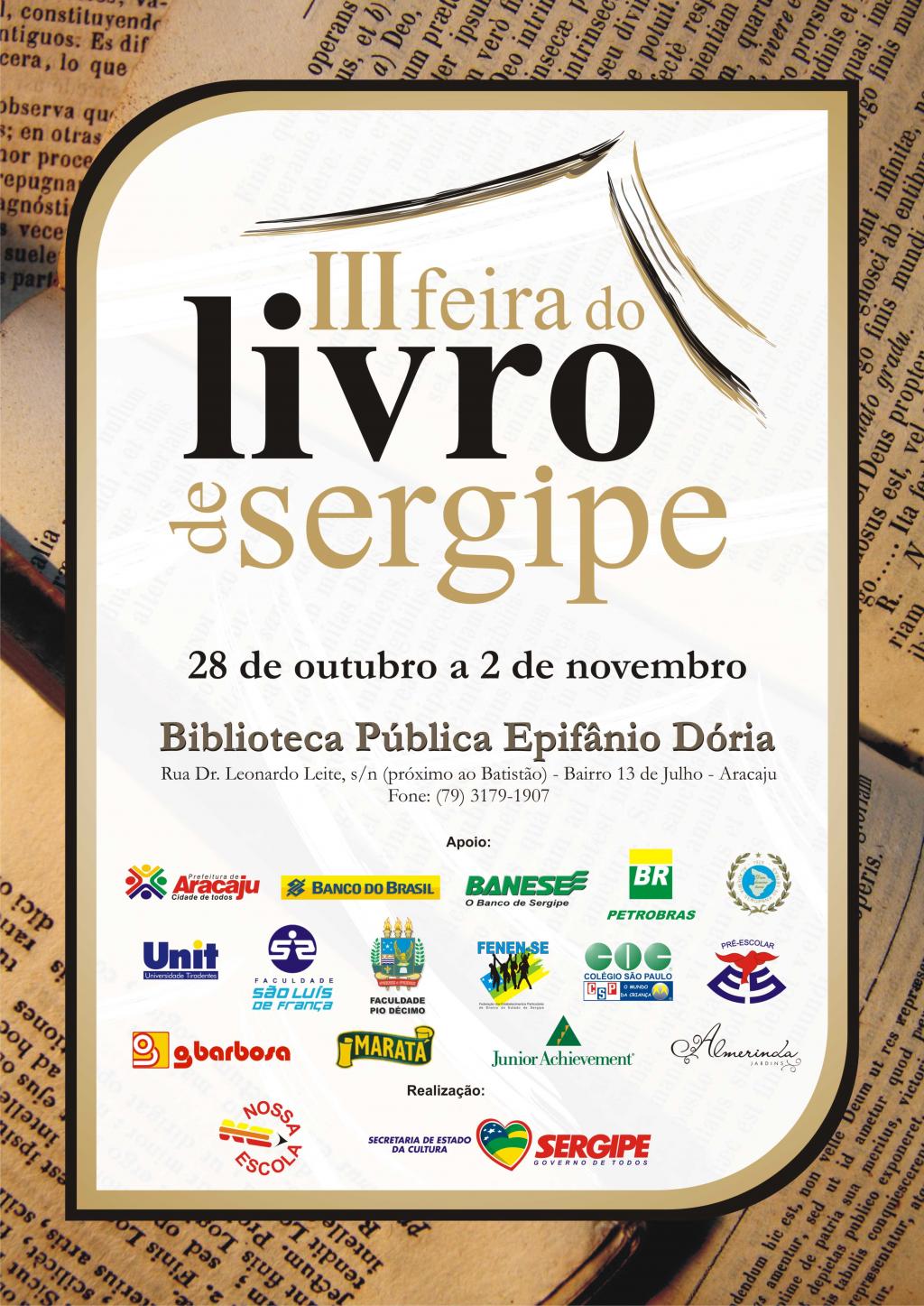 Teve início hoje, terça-feira, o maior evento literário do nosso Estado, a III Feira do Livro de Sergipe, que acontece na Biblioteca Pública Epifânio Dória, localizada na rua Drº Leonardo Leite, s/n, bairro 13 de Julho (próximo ao Batistão). O banquete cultural deste ano homenageia Machado de Assis, João Ribeiro, Tobias Barreto, Sílvio Romero, Chico Dantas e Santo Souza, além de trazer ilustres escritores da nossa literatura.