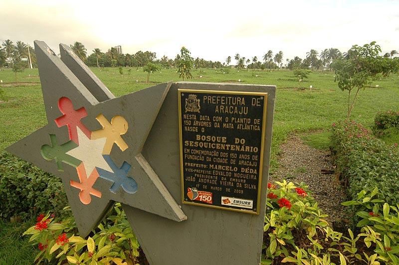 Uma reserva com espécies da mata atlântica, oferecendo um local aprazível para passeios e contemplação. Esta é a projeção que se faz sobre o futuro do Bosque do Sesquicentenário, implantado há um ano e três meses no parque da Sementeira, com exemplares da flora brasileira, em comemoração aos 150 anos da cidade de Aracaju. Lá, foram cultivadas mais de 150 mudas de mais de 30 espécies arbóreas originárias da mata atlântica brasileira. Algumas destas já estão até frutificando, como é o caso da Castanheira-do-Maranhão, que já alcança cerca de dois metros de altura. De acordo com o gerente de Áreas Verdes da Empresa Municipal de Serviços Urbanos (Emsurb), Francisco Ney Maia, responsável pelo bosque, são realizados frequentemente os serviços de limpeza do mato ao redor das mudas, capinação, combate a pragas e adubação orgânica. Neste período chuvoso, as plantas apresentam um crescimento significativo pois a incidência de chuvas favorece o desenvolvimento. Pensando nisso, fizemos anteriormente uma adubação específica com uma mistura de esterco e terra vegetal. O resultado pode ser verificado no desenvolvimento das plantas mesmo cultivadas num terreno relativamente arenoso, salientou o gerente. No bosque podem ser encontradas espécies como Ipê, Jacarandá, Pau-Brasil, Ingá, Canafístula, Pau Pombo, Aroeira, dentre outras plantas nativas que futuramente oferecerão muita sombra e um clima agradável praticamente no coração da capital, inserindo mais um elemento fundamental para a qualidade de vida da população.
