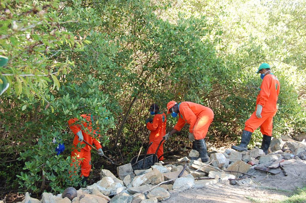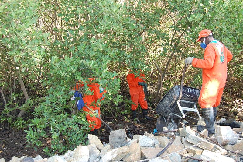 Para executar o serviço, os agentes adentram o mangue para fazer a catação do material com o auxílio de vassouras de aço e luvas, assim como botas de cano longo e máscaras. Os equipamentos de proteção são necessários, pois a estrutura das árvores - com vegetação densa, raízes altas e terreno pantanoso - impede a catação com pás, enxadas, carrinhos de mão ou máquinas.