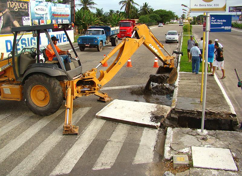 Durante toda a manhã desta quinta-feira, 21, equipes da Emurb realizaram a desobstrução das bocas-de-lobo das principais vias - as avenidas Heráclito Rollemberg e Hildete Falcão Batista. Com o apoio de uma caçamba, uma retroescavadeira e um caminhão 'muck', no início da tarde, um contingente de mais de vinte operários foi deslocado para a área. A mobilização visa construir um novo ramal para a rede de drenagem já existente. Neste primeiro momento, serão implantados quinze metros de tubos, aumentando a vazão das águas. A expectativa é de que a obra termine ainda esta noite, quando o trânsito no local será liberado.