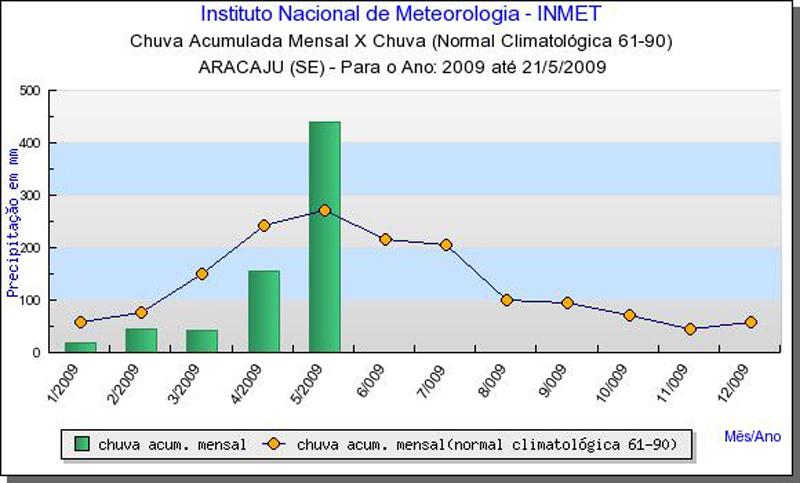 O grande volume de água que caiu na capital sergipana nas últimas semanas é atípico para o período. Segundo dados divulgados pelo Instituto Nacional de Meteorologia (Inmet), a chuva acumulada nas últimas 24 horas em Aracaju ultrapassou a marca de 50 mm e a acumulada mensal já chega a quase 450 mm, um número bastante superior ao previsto pelo Instituto, que seria de cerca de 280 mm. A previsão é de que o fim de semana também seja chuvoso, com tempo nublado a parcialmente nublado.