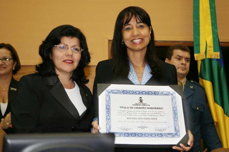 A baiana Rose Edna Mata Vianna Ponde, superintendente regional da Companhia Nacional de Abastecimento (Conab) nos Estados da Bahia e Sergipe, é a mais nova cidadã sergipana. Em solenidade realizada na noite dessa segunda-feira, 25, na Assembléia Legislativa, ela recebeu o título em função dos benefícios em favor dos pequenos agricultores do Estado. Moradores de diversos municípios do interior foram prestigiar a homenagem, que também contou com a presença do vice-prefeito de Aracaju, Silvio Santos, que representou o prefeito Edvaldo Nogueira.