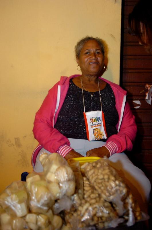 Embalada pelo forró animado do cantor Genival Lacerda, a pensionista dona Berdadete dos Santos, 58, residente no bairro Industrial, aproveita a festa para curtir o forró e garantir uma renda extra com a venda de amendoim e cana. "Essa é a primeira vez que vendo no Forró Caju, trouxe 20 saquinhos de amendoim e de cana e já consegui vender 10 sacos. No próximo ano quero investir mais, pois sei que dá certo", relata confiante.