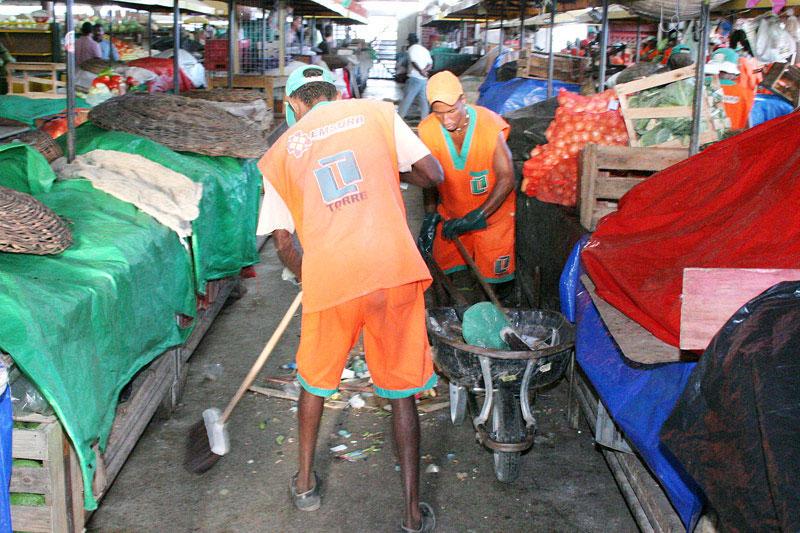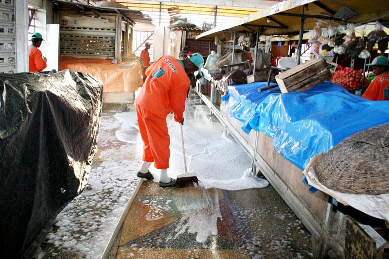 A Empresa Municipal de Serviços Urbanos (Emsurb) está intensificando a limpeza no mercado Albano Franco. A lavagem, que era feita de três em três meses, passou a ser feita mensalmente e a equipe de fiscais foi reforçada. Neste domingo, dia 15, acontece uma lavagem. Estamos tentando implementar uma limpeza mais eficiente no mercado, mas isso depende muito também da cooperação dos feirantes, afirma a gerente de abastecimento da Emsurb, Silvana Gomes. Segundo ela, um contrato novo permitiu a intensificação desse trabalho de limpeza. Com o contrato novo, que iniciou no último dia 24, vamos ter mensalmente essa lavagem. Antes nós tínhamos algumas dificuldades por conta do contrato anterior ser menos abrangente. O novo tem mais detalhes, algumas nuances administrativas que permitem que haja uma cobrança mais amiúde do serviço, explica. Com o objetivo de conscientizar o feirante para que ele colabore com essa limpeza, também foi reforçada a fiscalização no mercado. Nós reforçamos a equipe, aumentamos o número de fiscais, tanto os funcionários da Emsurb, quanto contratados. A resistência por parte dos feirantes ainda é grande. No dia-a-dia é feita a limpeza com varrição, lavagem e recolhimento do lixo, só que o próprio feirante não tem uma cultura de manter a limpeza. A gente limpa e na mesma hora eles vão lá e sujam. Os fiscais conversam, esclarecem que a limpeza é para o próprio bem deles e que o usuário também se sente melhor, conta Silvana. Lavagem de domingo Essa primeira nós vamos fazer junto com a empresa contratada e vamos levar um reforço de três equipes da Torre. A gente faz uma lavagem geral com água dos carros-pipas e dos próprios hidrantes do mercado. Jogamos água com sabão geléia, desengraxante e depois um produto para criar o odor de limpeza. Também vasculhamos e limpamos o teto das bancas, diz a gerente. Silvana Gomes informa ainda que a lavagem no domingo começa às 13 horas. Essa limpeza mais pesada precisa ser feita com o mercado vazio. No domingo o mercado fecha ao meio-dia. Já na segunda-feira, que é o dia de menor movimento, encerraremos a lavagem no período da tarde, destaca.