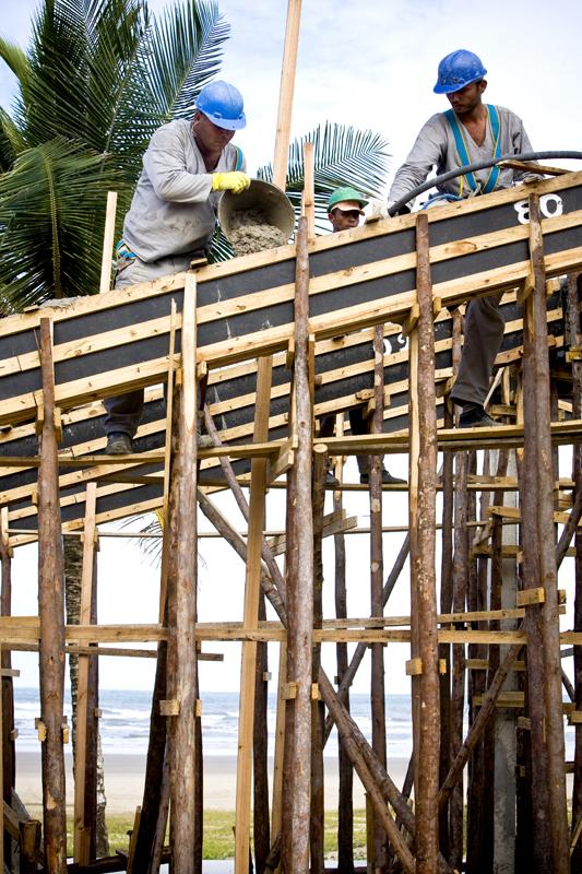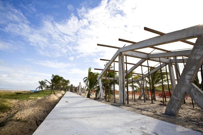 As novas unidades foram divididas em três módulos. O primeiro, com seis quiosques, é o mais adiantado. "Nessa etapa inicial já avançamos bastante e agora estamos trabalhando na colocação da cobertura", informa o engenheiro da Empresa Municipal de Obras e Urbanização (Emurb), Luiz José Dias Gomes. Com todos os pilares levantados, o trecho conta ainda com um passeio que dá acesso ao mar, além do muro de contenção.