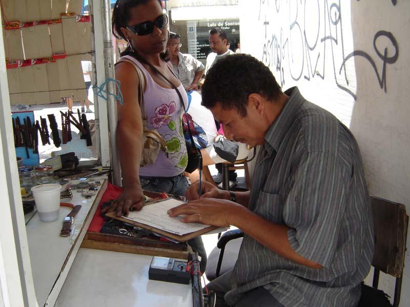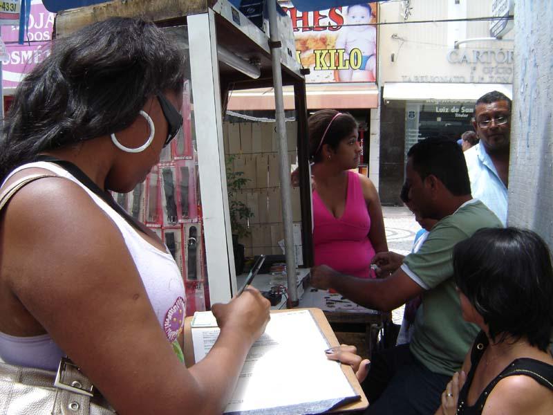 A Prefeitura Municipal de Aracaju (PMA), por meio da Empresa Municipal de Serviços Urbanos (Emsurb), está realizando desde o início da semana o recadastramento dos ambulantes do Centro de Aracaju, com o intuito de organizar o comércio na área. O último cadastramento ocorreu ano passado. De 2006 para cá, o comércio já aumentou bastante e organizar a área com freqüência é preciso. Percebemos que já tinha ambulante atrapalhando até o trânsito, sem contar os que ficam na calçada impedindo a passagem de pedestres, afirma o gerente de Espaços Públicos, Antônio Pereira. Segundo a lei municipal 1.500/89, que regulamenta este tipo de prática na cidade, é proibido o comércio ambulante em distância inferior a cinco metros das esquinas, nos abrigos de transporte coletivo e nas calçadas com largura inferior a dois metros. No primeiro momento, a Emsurb faz a abordagem do ambulante. Perguntamos se tem autorização. Caso não tenha, fazemos a notificação. Depois de feita a notificação, os ambulantes têm o prazo de 24 horas para irem à Emsurb e regularizar a situação, explica a fiscal Heloísa Rodrigues. Fiscalização de Espaços Públicos A equipe de fiscalização da Emsurb possui uma rotina diária na cidade, com o intuito de organizar os espaços públicos. Os 40 fiscais fazem a notificação e, quando necessário, a apreensão das mercadorias. Fazemos a notificação e se houver reincidência é que a mercadoria é apreendida, explica Pereira. A mercadoria apreendida é levada para a sede da Emsurb (no Parque da Sementeira) e devolvida mediante a apresentação da nota fiscal. No caso de alimentos perecíveis, eles são doados para entidades.