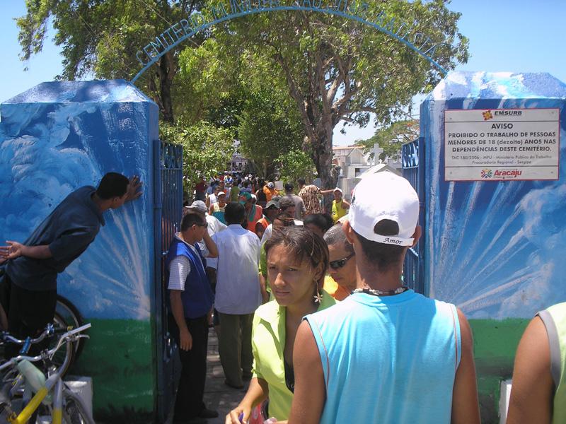 Milhares de pessoas visitaram na última sexta-feira, dia 2, os cemitérios municipais (São João Batista, no Castelo Branco; Helena Bandeira, na Atalaia; e dos Povoados Areia Branca e Mosqueiro e ABC, no Jardins) e assistiram as missas em homenagem aos mortos no Dia de Finados. Por isso, a Empresa Municipal de Serviços Urbanos (Emsurb) contou com duas equipes, com 15 agentes cada, que estiveram de plantão durante todo o dia. Deixamos essas equipes à disposição para qualquer eventualidade que ocorresse. Elas circularam também nos cemitérios da cidade para evitar o excesso de lixo, principalmente de flores jogadas ao chão, conta o coordenador de Vias Públicas de Aracaju, Everaldo Ferreira Para a advogada Enilde Santos Almeida, a organização ao redor e dentro dos cemitérios foi melhor este ano. O cemitério ficou mais limpo do que em outros anos; a fachada dele ficou bem mais bonita com essa nova pintura, antes parecia que ele estava largado ao acaso, conta. Enilde diz ainda que está correto a proibição de menores de idade trabalharem na limpeza das lápides. Essa questão da proibição dos menores de idade trabalharem na limpeza das lápides está certíssima, pois lugar de criança é na escola, enfatiza. Os fiscais da Emsurb circularam pelos cemitérios com o objetivo de coibir o trabalho infantil e de adolescentes menores de 18 anos, realizando serviços de limpeza e manutenção em lápides, mausoléus, carneiras, jazigos ou gavetas. Essa ação contou também com o auxílio de educadores da Secretaria Municipal de Assistência Social e Cidadania (Semasc), guardas municipais e dos servidores que estiveram de serviço nesses espaços públicos.