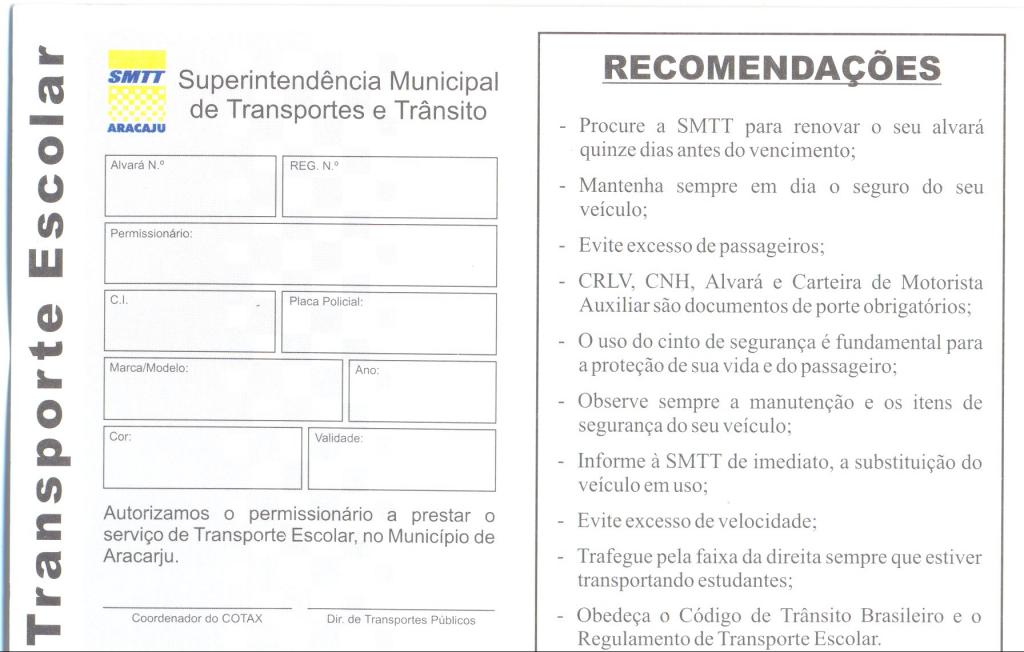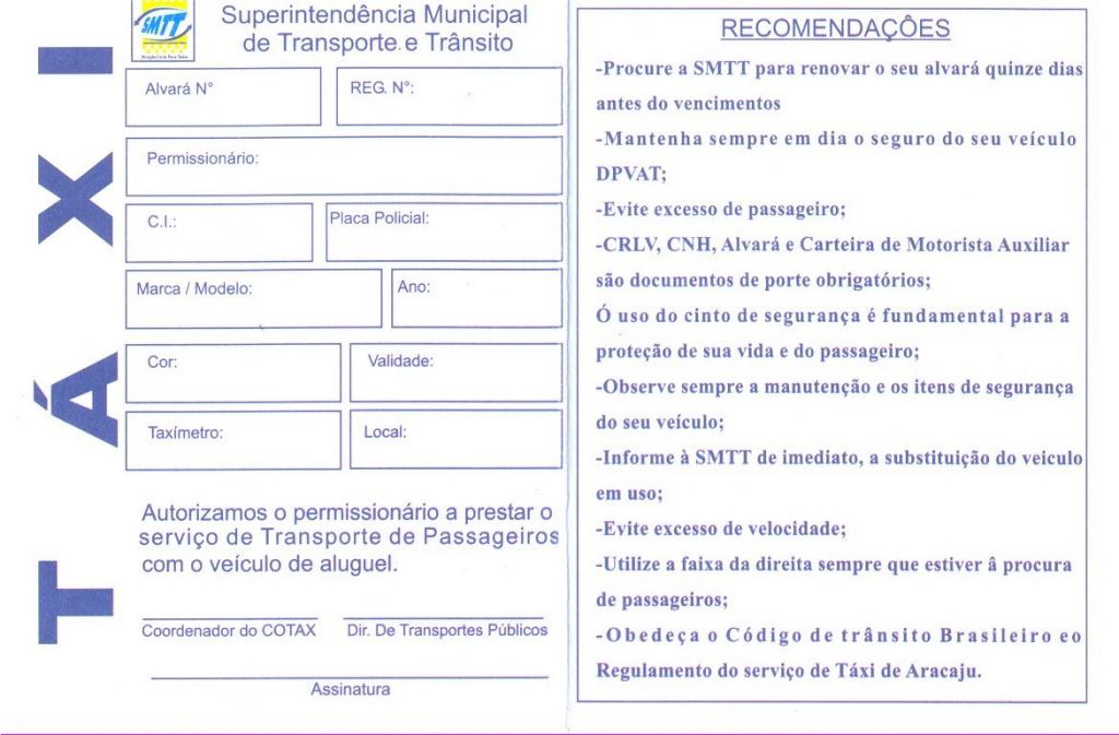 A partir desta quinta-feira, 4, os alvarás de táxi e transporte escolar deverão ser renovados na sede da Superintendência Municipal de Transporte e Trânsito de Aracaju (SMTT). Esse é um documento concedido ao permissionário (dono do ponto) do serviço de táxi ou transporte escolar que legaliza o exercício diário da profissão e é emitido anualmente de acordo com o calendário de licenciamento do Detran.