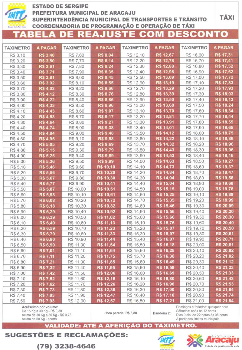 Atendendo a uma solicitação do Sindicato dos Taxistas de Sergipe (Sintax), a Superintendência Municipal de Transporte e Trânsito de Aracaju (SMTT) já está disponibilizando para os taxistas da capital a tabela com os valores das corridas após o reajuste aprovado pelo órgão. A medida tem o objetivo de evitar prejuízos aos taxistas que ainda vão fazer a aferição do taxímetro.