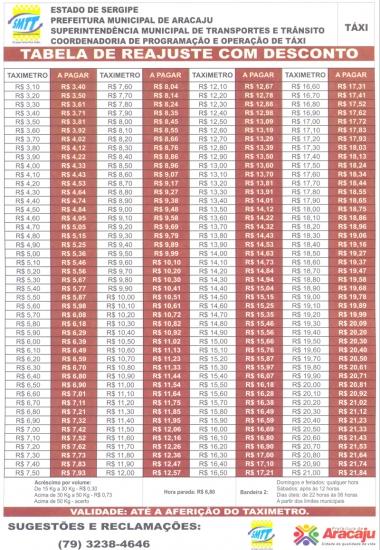 Para não prejudicar os taxistas que ainda não realizaram a aferição, a SMTT está disponibilizando a tabela com os valores das corridas atualizados. Com ela, os taxistas podem trabalhar com o valor reajustado até que a nova tarifa esteja no taxímetro. A tabela pode ser solicitada na Coordenadoria de Táxi da SMTT.