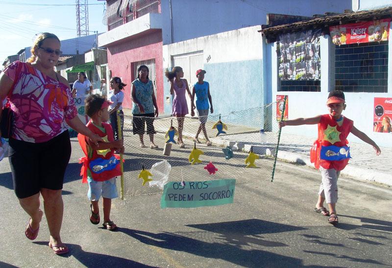 Ao som das músicas ‘Que o rio ria' e ‘Herdeiros do Futuro', os alunos percorreram as ruas do bairro Porto Dantas vestidos com aventais ecológicos, atraindo não só os olhares atentos dos pais como também de toda a comunidade, a exemplo de representantes da Associação de Moradores.