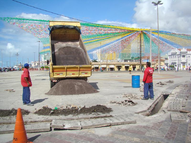Localizada entre os mercados Thales Ferraz e Albano Franco, a praça de eventos é ponto de passagem diária de frequentadores do centro comercial da cidade. No período junino, o volume de lixo produzido aliado às chuvas provoca a formação de pontos de alagamento no local. Durante toda a semana, equipes da Emurb realizam a limpeza da rede e a reposição das grelhas, além de pequenos reparos nas calçadas danificadas. A previsão é que até o final da próxima semana os serviços sejam finalizados.