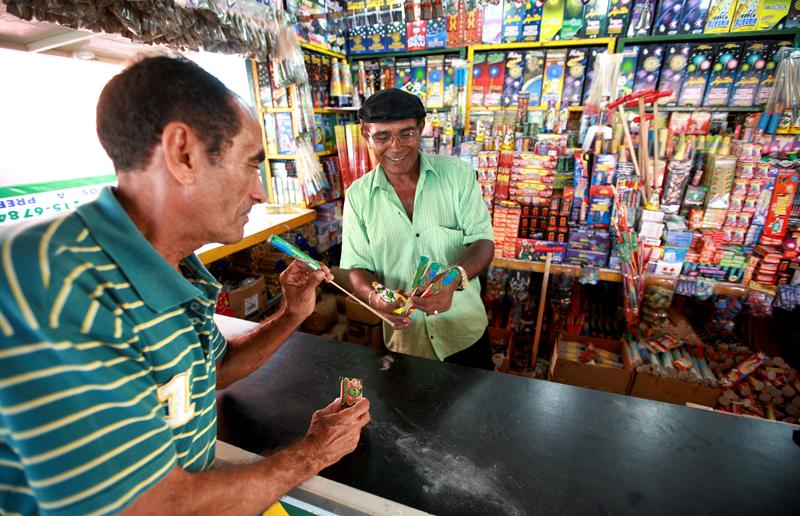 Há 25 anos, a professora Virginia Cristina monta barraca junto com seus filhos. "Este ano tenho certeza que as vendas vão aumentar porque, além do São João, é ano de Copa do Mundo e as pessoas sempre gostam de comemorar a vitória do Brasil com muita queima de fogos", afirma.
