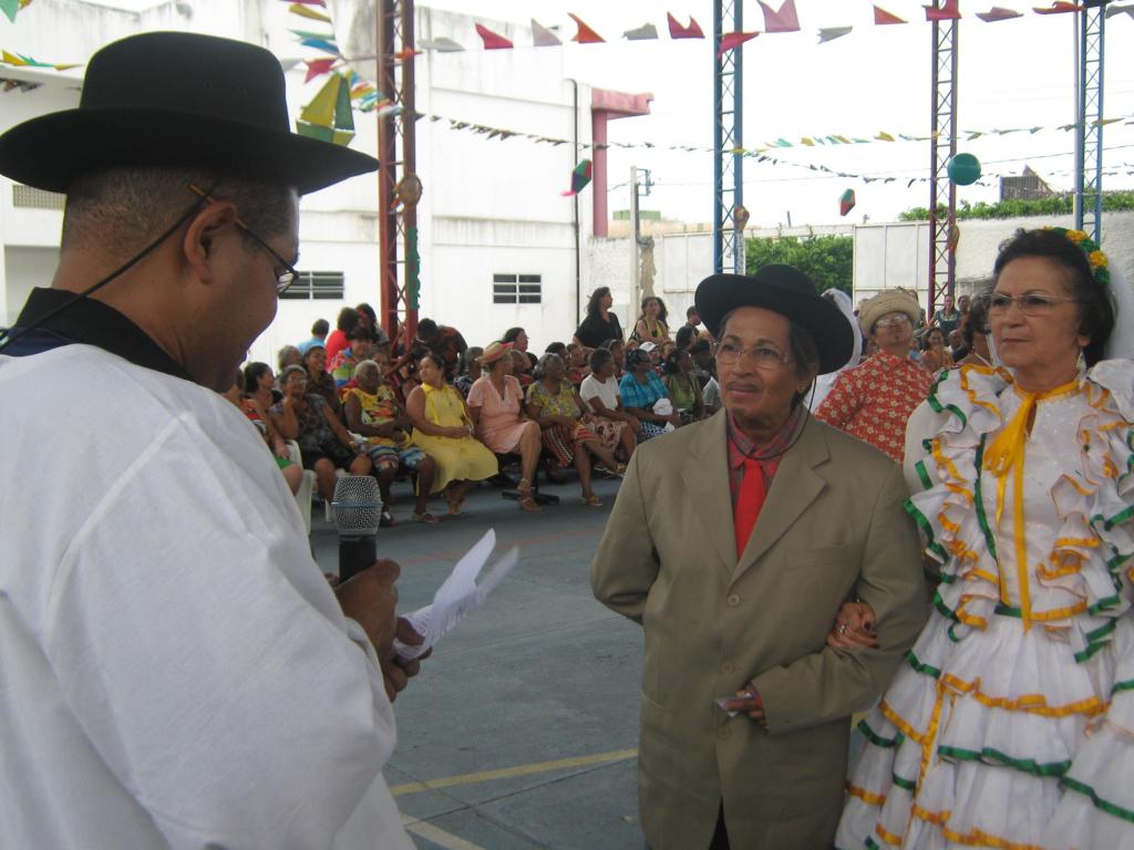 No arraial de hoje, os idosos dos grupos de convivência apresentaram quadrilhas juninas com direito a casamento matuto. "Vim vestida a caráter para a festa porque gosto muito de dançar forró. No grupo de idosos que participo, o Renascer, me apresento com quadrilha, samba de coco e pastoril. A melhor coisa do mundo foi a prefeitura fazer esses eventos para que o idoso possa se divertir e dançar", diz Dona Lenita dos Santos, 65 anos, usuária da USF Oswaldo de Sousa, que fica no bairro Cirurgia.
