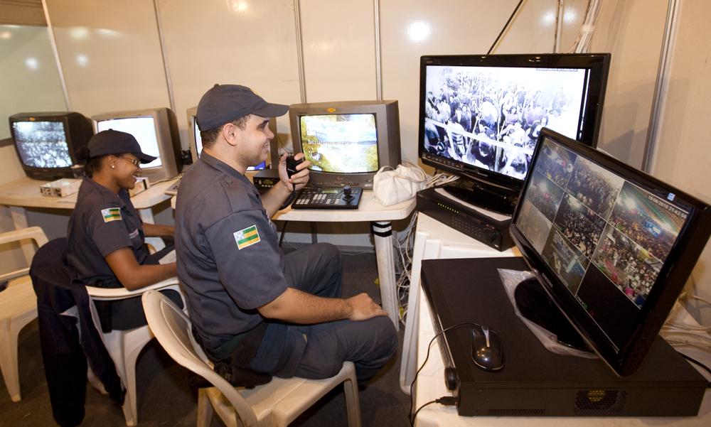 Um destaque desse grande esquema de segurança é o monitoramento através de câmeras de vídeo. Foram instaladas 24 câmeras na região interna e na parte externa da festa. Na sala dos monitores trabalham dois policias e um técnico de vídeo que acompanham tudo.