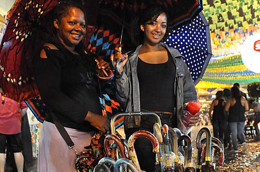 Ao lado de sua filha, a vendedora Luciana Pontual diz que chega a vender uma média de 50 guarda-chuvas por noite. "Se eu disser que já comprei um carro, você acredita? Foi um carro usado, mas eu consegui comprar com a renda daqui do Forró Caju. Vou continuar vendendo até o último dia", disse orgulhosa. "Espero que continue chovendo", brinca.
