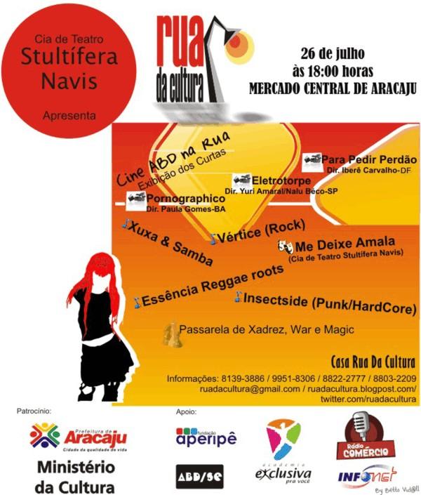 No dia 26 de Julho, a Rua da Cultura, espaço cultural apoiado pela Fundação Municipal de Cultura, Turismo e Esporte (Funcaju) na região dos Mercados Centrais, contará com a exibição de curtas metragens. A novidade é fruto da parceria entre a Casa Rua da Cultura e a Associação Brasileira de Documentaristas e Curta-Metragistas (ABD/SE). A exibição acontece às 18 horas, com reprise às 21h.