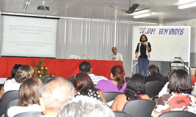 Durante encontro realizado na manhã desta sexta, 6, no auditório do Centro de Aperfeiçoamento de Recursos Humanos (Cemarh), a secretária municipal da Educação, Tereza Cristina Cerqueira da Graça, e o grupo de trabalho (GT) formado por coordenadores gerais de unidades escolares discutiram assuntos relacionados ao desempenho das escolas municipais no Índice de Desenvolvimento da Educação Básica (Ideb/2009). A reunião serviu também para acertar os detalhes da cerimônia de premiação do ‘I Concurso Artístico-Literário da Rede Municipal de Ensino', que acontecerá na próxima terça-feira, 10, às 8h, no Ginásio de Esportes do Serviço Social da Indústria (Sesi), localizado no conjunto Augusto Franco.