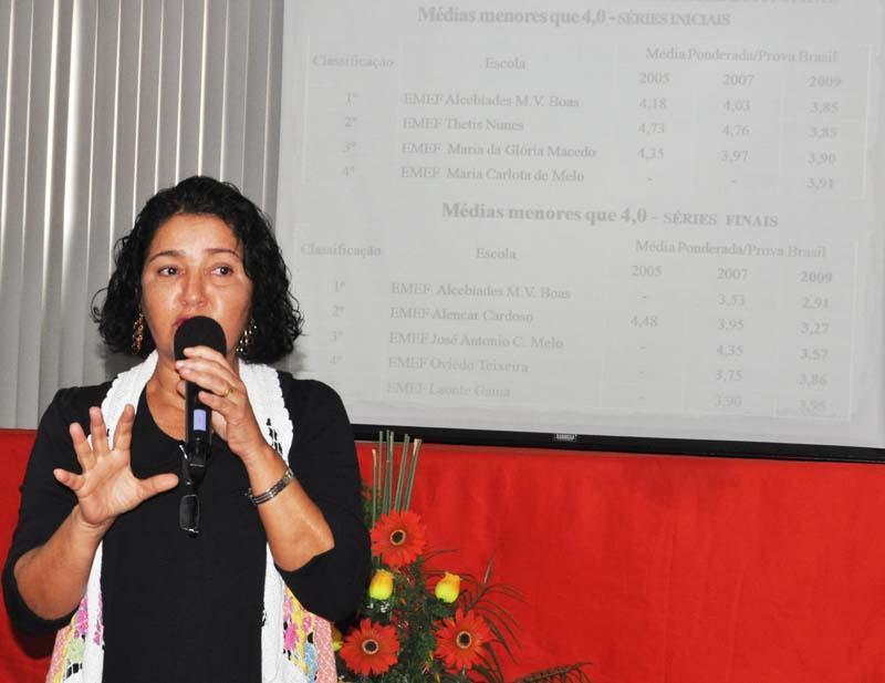 Na ocasião, Tereza Cristina fez uma síntese demonstrativa dos resultados do Ideb e da Prova Brasil referentes a 2009, comparando com os índices alcançados nos anos anteriores. "Estamos na terceira edição do Ideb e comemoramos a melhoria do desempenho das escolas municipais. Algumas delas receberam homenagens dos técnicos da Semed, que entregaram flores, placas e fizeram a divulgação em faixas e carros de som. Mesmo com o crescimento de dois décimos no índice, ainda assim precisamos listar sem receios o que precisa ser melhorado", colocou a secretária municipal da Educação.