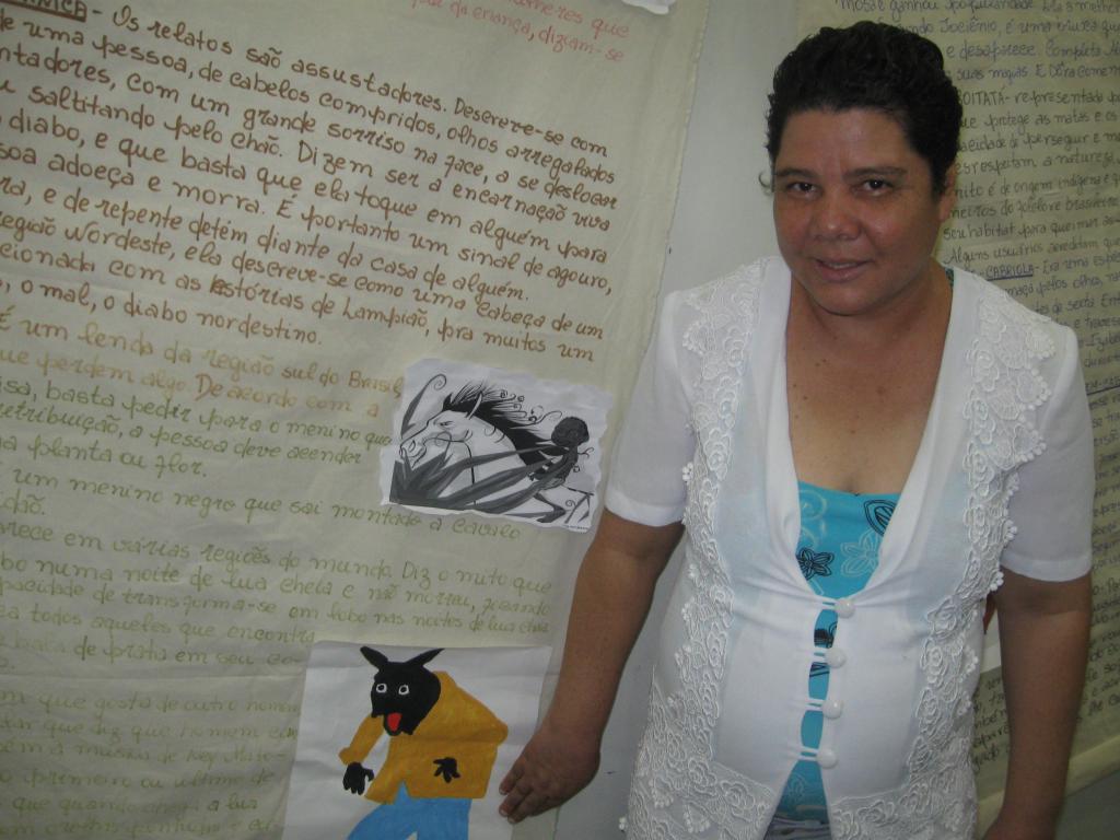 Usuária do Caps Liberdade há 5 anos, Maria Auxiliadora de Souza Ramos faz questão de ressaltar sua contribuição para a mostra. "Ajudei a contar as histórias da Cuca, do lobisomem, da mula-sem-cabeça. Ficou tudo muito interessante, muito lindo de se ver!", diz Maria, detalhando cada lenda que lhe cativou.