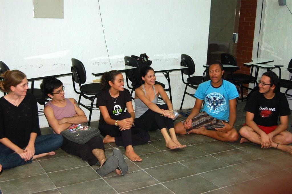 Uma aula diferente. Sentados, os alunos do curso livre do 'Teatro ao Cinema: técnicas para atores e diretores' trocaram experiências e deram início aos trabalhos teóricos e práticos. Todo o conjunto da aula está sendo conduzido pela professora Natasha Faria, formada pelas escolas Profissional de Artes e Ofícios de Lisboa e Superior de Teatro e Cinema de Lisboa. O curso está sendo realizado no Núcleo de Produção Digital Orlando Vieira, Aracaju | Programa Olhar Brasil, em parceria com a Secretaria do Audiovisual | MinC.