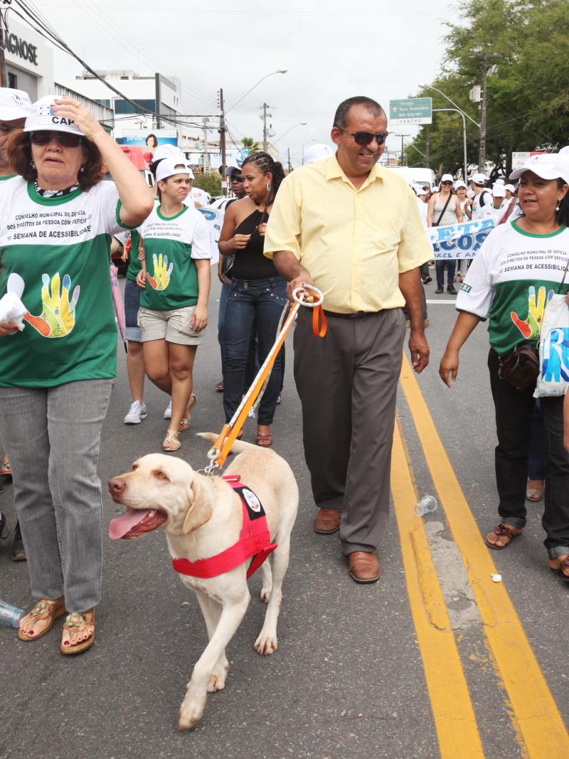 O deficiente visual Jocivaldo Silva de Jesus, 40 anos, foi para a caminhada com uma missão diferente: treinar seu novo cão guia. Neste mês essa é a segunda vez (a primeira foi durante o desfile de 7 de Setembro) que ele caminha pela avenida Desembargador Maynard para treinar Brasa, cachorro do Corpo de Bombeiros que o está auxiliando.