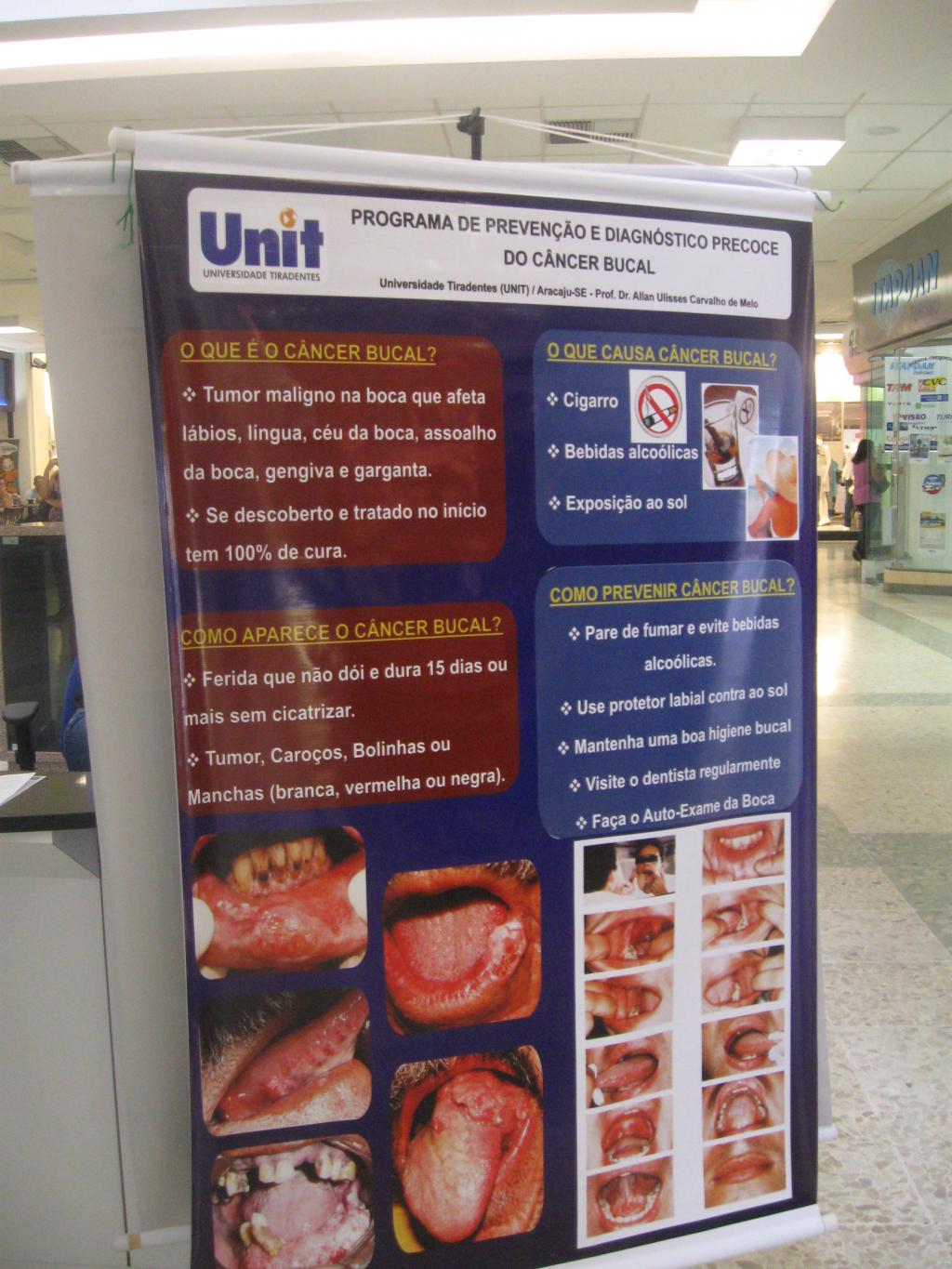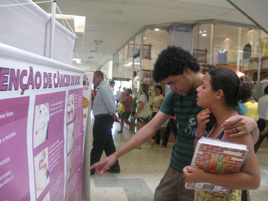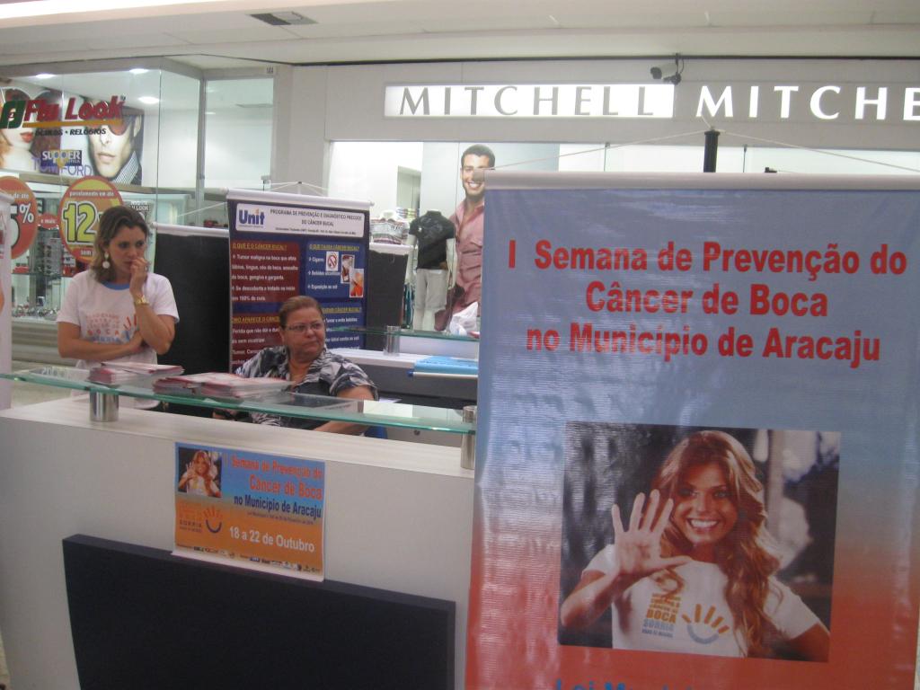 A Semana de Prevenção ao Câncer de Boca em Aracaju está promovendo uma série de atividades de conscientização. Uma das ações acontece no Shopping Riomar, onde foi montado um stand para distribuição de panfletos e exposição de banners. No local, as pessoas também podem obter informações sobre o tema com dentistas da Secretaria Municipal de Saúde (SMS), do Conselho Municipal de Saúde (CMS) e do Conselho Regional de Odontologia (CRO-SE).