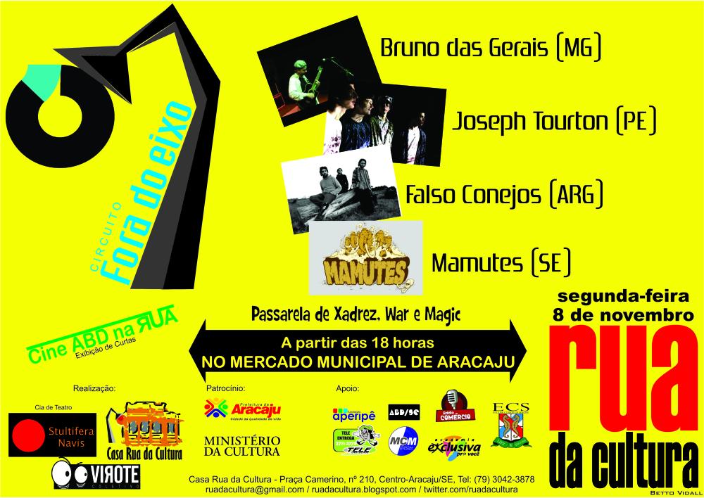 Realizada com o apoio da Prefeitura de Aracaju, a Rua da Cultura recebe mais uma edição do ‘Circuito Fora do Eixo', uma rede colaborativa de coletivos de cultura distribuídos pelo Brasil. Nesta segunda, 8, a partir das 18h, se apresentam no palco montado no mercado municipal as bandas Bruno das Gerais (MG), Joseph Tourton (PE) e Mamutes (SE), além da internacional Falsos Conejos, da Argentina.