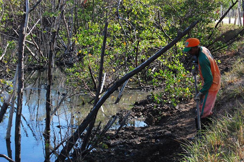 A Emsurb também fez a recomposição da área verde no entorno do Parque, com o plantio de grama na margem do manguezal. "Essa recomposição é importante para impedir o assoreamento do local e evitar que a água fique acumulada em apenas uma parte do mangue", informa Francisco Ney, gerente de Áreas Verdes. Foram utilizadas 500 m² de grama tipo seda e 10 m³ de terra preta.