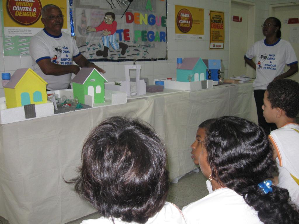 Crianças e adolescentes da Escola Alcebíades de Melo Villas Boas puderam participar de palestra sobre a dengue dentro da unidade de saúde. "Um só mosquito pode picar até dez pessoas, que devem adoecer pelo período de três a 15 dias, com sintomas como febre alta, dor de cabeça, manchas vermelhas no corpo. Para evitar esse mal vocês devem agir como uma espécie de fiscais dentro de suas próprias casas, não deixando nenhum depósito de água sem proteção", informou o supervisor dos agentes de endemias, José Magnone Santos, que proferiu a palestra para os estudantes.