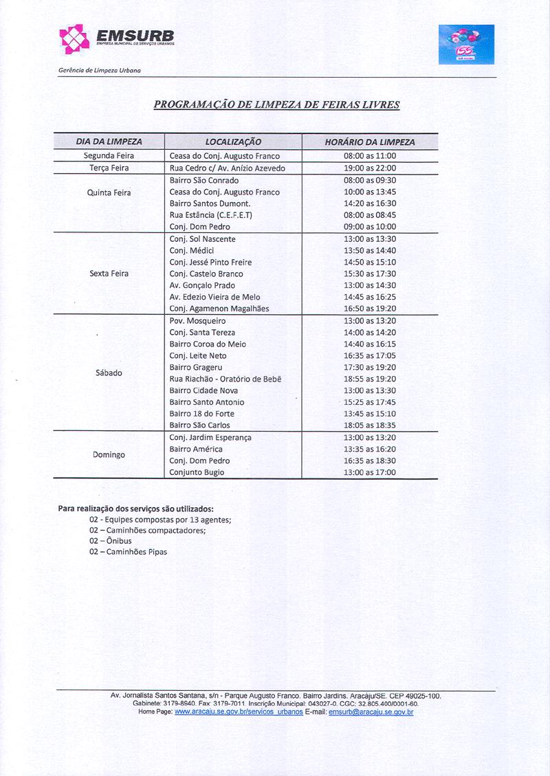 Para garantir a manutenção e organização das feiras livres, a Prefeitura de Aracaju, por meio da Empresa Municipal de Serviços Urbanos (Emsurb), está concluindo um amplo estudo sobre o assunto. Segundo a presidente da Emsurb, Lucimara Passos, a iniciativa visa melhorar as feiras administradas pelo município. "Estamos concluindo estudos que têm como objetivo estabelecer parâmetros de organização e qualidade para modernizar a administração das feiras e assegurar à população a melhoria dos serviços prestados", informa.