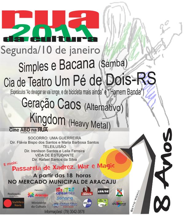 Realizada com o apoio da Prefeitura de Aracaju, a programação da Rua da Cultura mistura mais uma vez vários ritmos. Na próxima segunda, 10, a partir das 18h, o Mercado Municipal de Aracaju recebe o samba da banda ‘Simples e Bacana', o som alternativo da ‘Geração Caos', e o heavy metal da ‘Kingdom'. Além da apresentação da Cia de Teatro ‘Um Pé de Dois'.