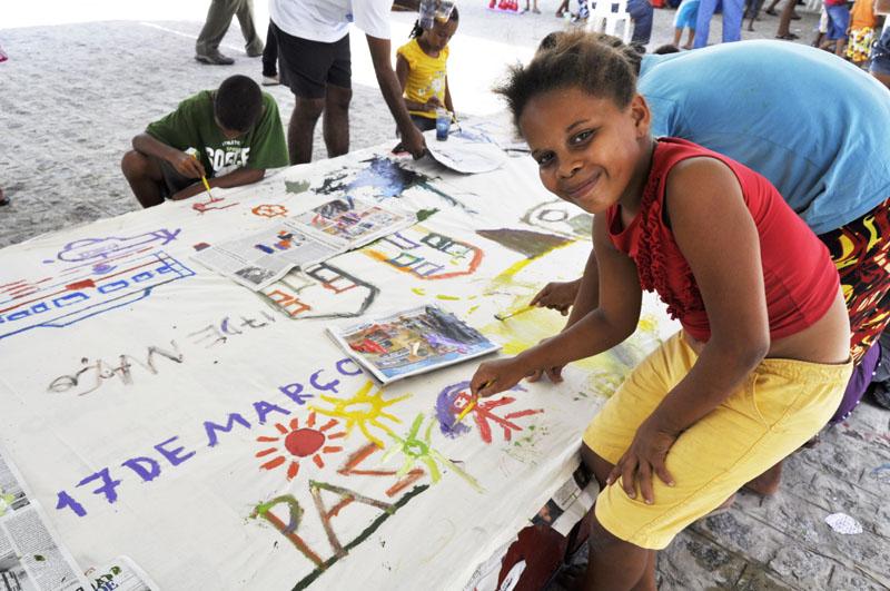 "A arte é um elemento indispensável para o desenvolvimento infantil saudável. Através dela, os meninos e meninas podem expressar suas emoções de forma lúdica e até adquirir um sentimento de pertencimento e valorização da cidade onde habitam", explicou o educador, ao orientar a pequena Daniele Santos, 10 anos, que nitidamente associou ao seu habitat o exercício da cultura de paz. "Antes de vir para o bairro 17 de março, eu e a minha família morávamos numa favela onde havia muita violência. Agora posso dizer com orgulho que a minha casa é um espaço onde há muita paz e alegria", declarou Daniele.