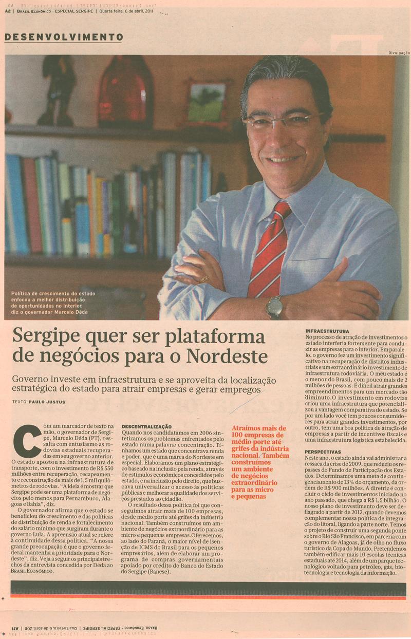 O jornal Brasil Econômico, um dos principais veículos de comunicação especializados em economia do país, publicou, nesta quarta-feira, 06, um suplemento especial dedicado à Sergipe, mostrando as potencialidades do estado nas mais diversas áreas. E um dos destaques do caderno é uma entrevista com o prefeito Edvaldo Nogueira, onde ele fala sobre o maior desafio enfrentado atualmente pela capital do menor estado do Brasil: o grande crescimento populacional.