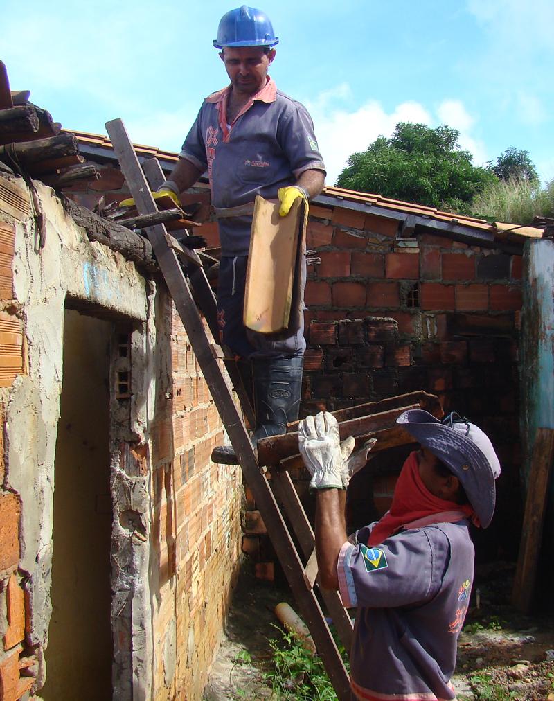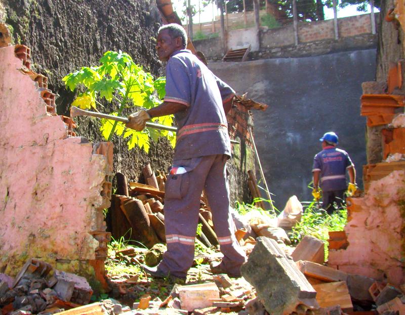 Uma equipe composta por seis profissionais realiza a operação de demolição dos imóveis. Por se tratar de uma região de encosta, de difícil acesso, o serviço está sendo realizado manualmente, sem o auxílio de máquinas.