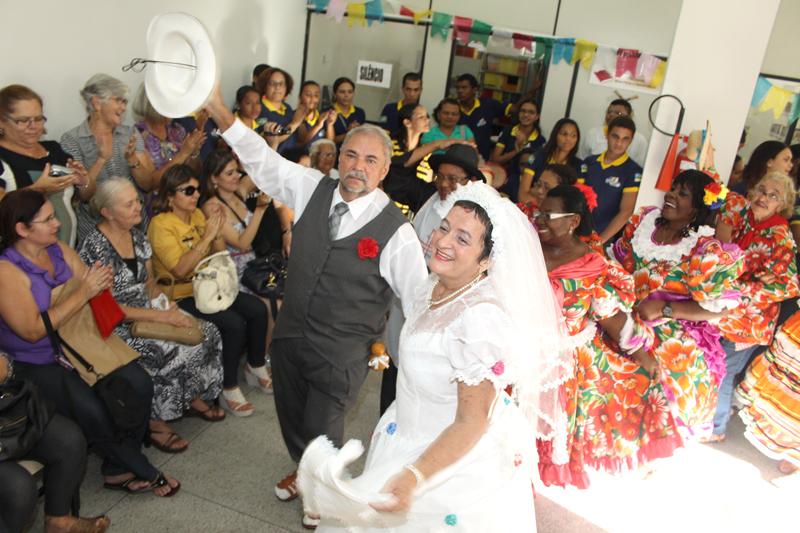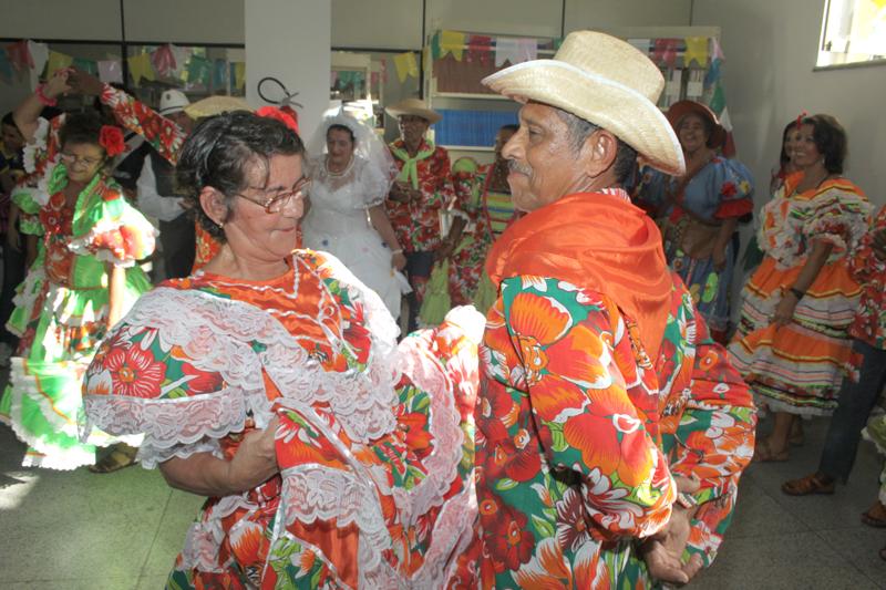 O senhor Heribaldo Doroteu e dona Maria Luíza voltaram aos tempos de namoro. Casados há 36 anos, os dois foram os noivos da quadrilha. "Depois que ele se aposentou, eu o arrastei comigo para a quadrilha. Esse já é o segundo ano que a gente dança junto", revela dona Luíza. "Com esse charme, não tinha como eu dizer não. Mas isso aqui é muito bom. Ao invés de ficar em casa sem fazer nada, estamos ocupando a mente e o corpo", responde Heribaldo.