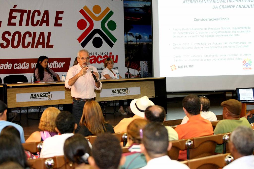Dando continuidade à discussão sobre a obra do Aterro Sanitário da Região Metropolitana de Aracaju, o prefeito Edvaldo Nogueira reuniu líderes comunitários e representantes de movimentos sociais da capital na noite desta quinta-feira, 4, no auditório do Banese. Durante o encontro, o prefeito apresentou o projeto para a construção do aterro que irá solucionar o grande problema da destinação do lixo, que hoje soma 470 toneladas diárias.
