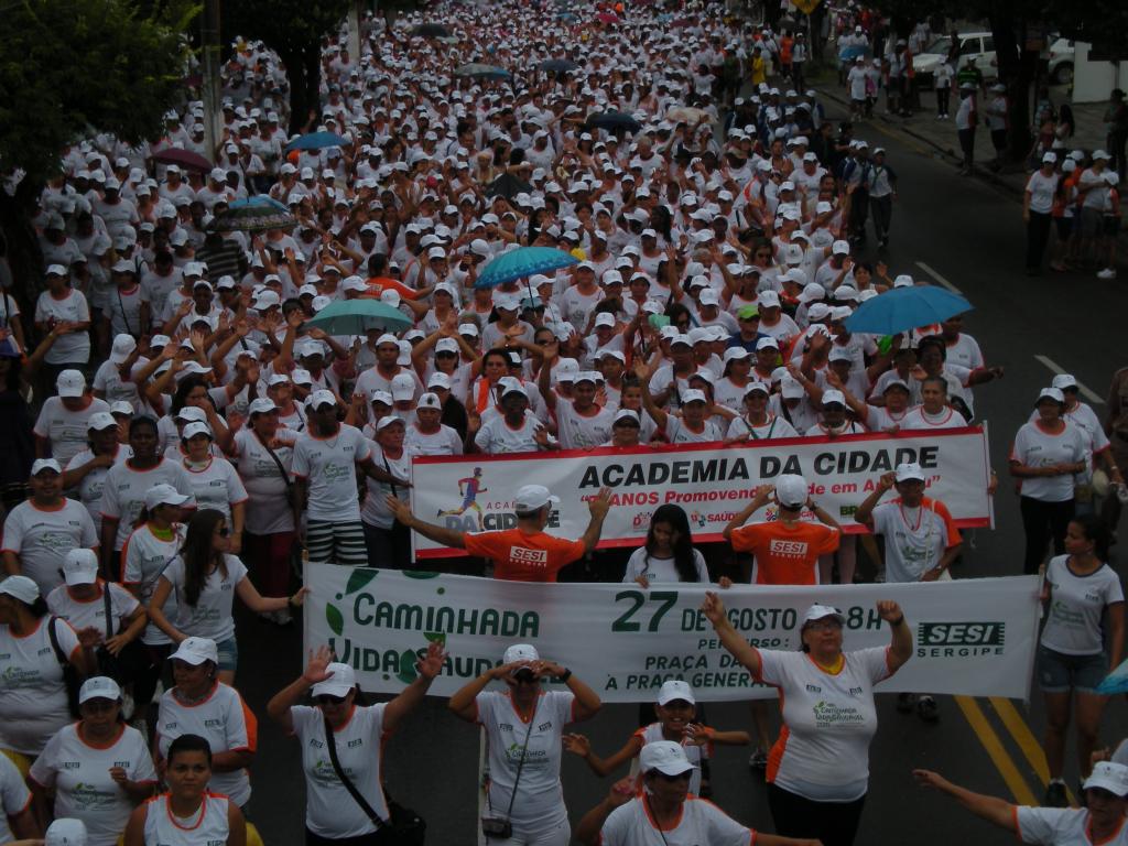 Os usuários e profissionais do Programa Academia da Cidade, da Prefeitura Municipal de Aracaju (PMA), participaram, no último sábado, 27, da 6ª Caminhada Vida Saudável do SESI. O evento trouxe como tema a "Sustentabilidade para a Qualidade de Vida e Bem-estar". A concentração aconteceu na Praça da Bandeira, às 8h, e contou com a presença de 1.500 alunos da Academia da Cidade. A caminhada seguiu pelas avenidas Barão de Maruim, Ivo do Prado e Rio Branco até a Praça General Valadão. Segundo secretário Municipal da Saúde, Silvio Santos, foi a sexta vez consecutiva que o programa da SMS participou da caminhada do SESI. "A parceria com o Sesi está consagrada na agenda da Saúde, para estimular nos aracajuanos a prática de hábitos saudáveis, como o de caminhar e de comer alimentos cada vez mais nutritivos. O nosso exemplo é um sucesso. Não é à toa que Academia da Cidade de Aracaju é referência no país, resultado de um esforço coletivo", afirma Silvio Santos. Segundo a coordenador de Atividades Físicas do Programa, Magno Carvalho, a caminhada do Sesi trouxe uma abordagem importante, associando a vida saudável à necessidade de adotar uma alimentação equilibrada, sem esquecer da prática de atividades físicas. "É fundamental lembrar que caminhada aconteceu na semana das datas comemorativas das categorias de educadores físicos, dia 31 de agosto, e de nutricionistas, dia 03 de setembro. Para a Academia da Cidade, o evento é um momento não só de sair da rotina, como de mostrar que o programa está de portas abertas para todos", explica Magno Carvalho. Benefícios Caminhar com frequência promove diversos benefícios para saúde, como perda de peso, aumento da flexibilidade do corpo e fortalecimento do sistema imunológico. Joselivia Souza conta que participa todos os anos da caminhada. "A academia facilita a participação em diversos encontros diferentes, isso é ótimo porque a energia positiva e a alegria boa contagiam o aluno. Já tem sete anos que frequento o pólo da Academia no Bairro América. Sinto que um dos principais benefícios da caminhada é que ajuda a melhorar a resistência física", conta Dona Joselivia. Já para Genilson Santos, que há quatro anos faz parte da Academia da Cidade no pólo Bairro Industrial, participar da caminhada é um incentivo importante. "É muito bom participar da caminhada. Já é a quarta vez que faço o percurso. Graças ao acompanhamento dos professores e as aulas constantes de alongamento, corrida e ginástica, sinto que a cada ano completo a caminhada com mais disposição", diz Genilson.