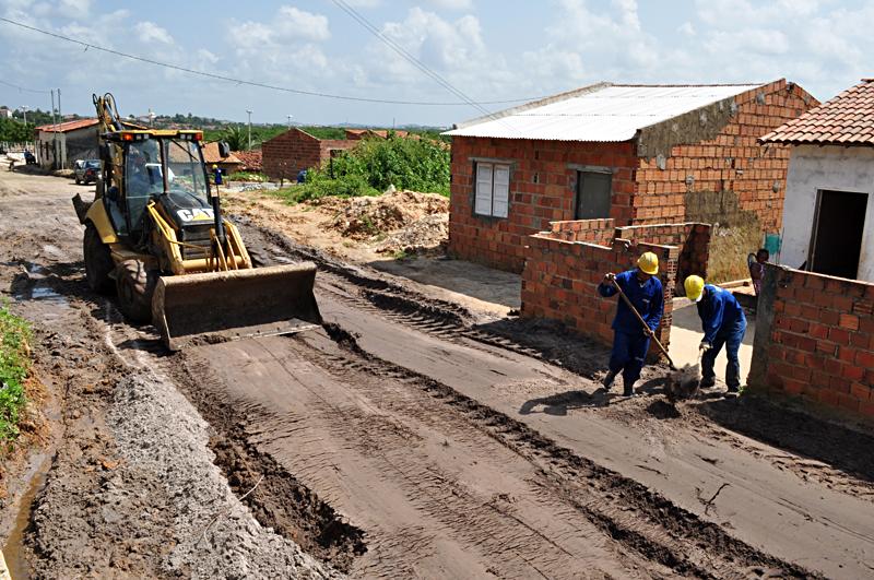 No local, aproximadamente 20 profissionais, entre serventes, pedreiros e operadores de máquina executam os serviços. Esta semana, as equipes estão realizando a terraplanagem nas ruas G e N, da segunda etapa do loteamento. Em seguida, será iniciada a implantação da rede de drenagem com a colocação das caixas coletoras e, logo após, a pavimentação em paralelepípedo das vias.